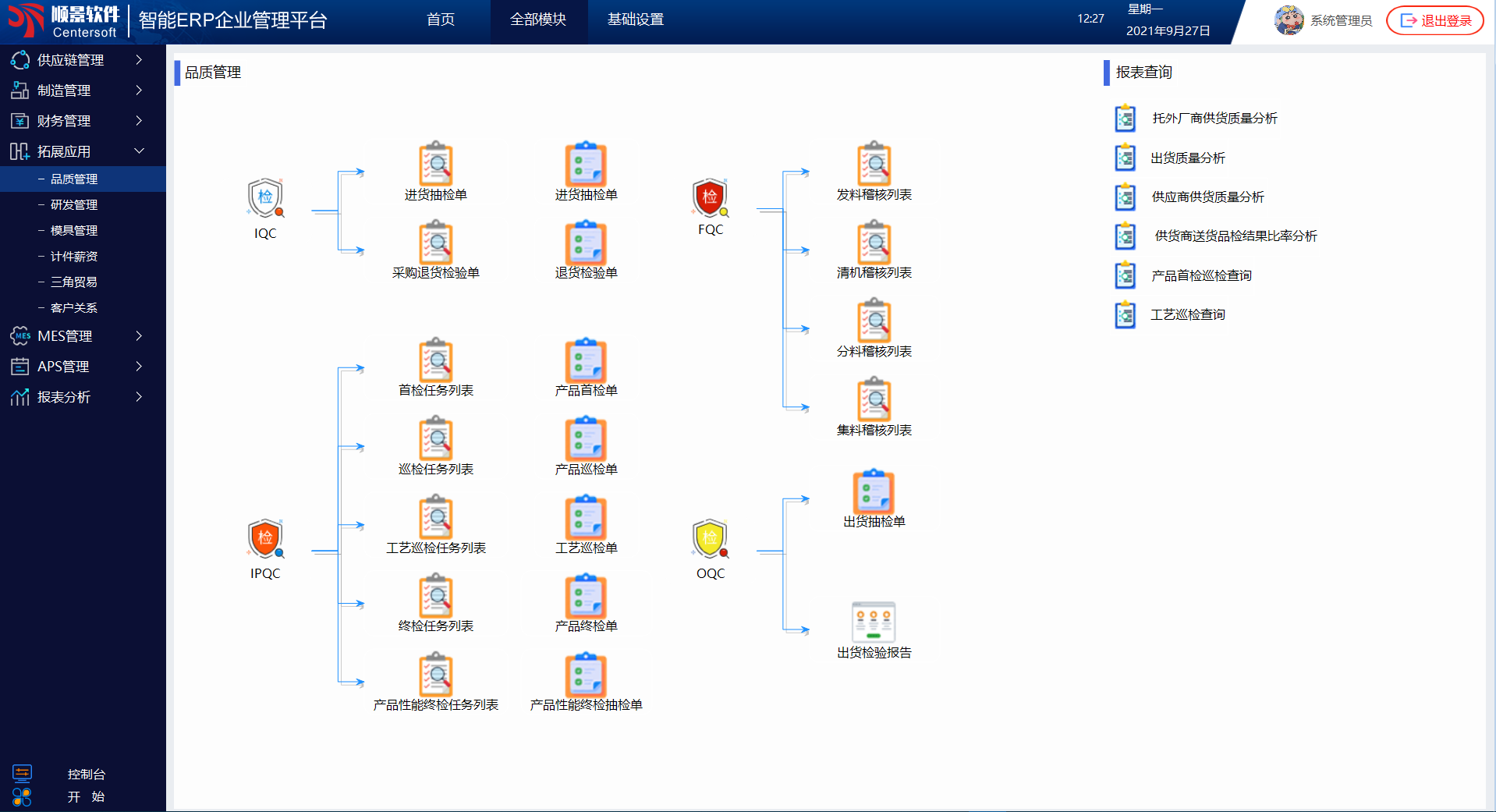 品质及生产过程监控,是顺景S9 ERP另一管控重点;IQC来料检验,会由系统生成质检工令单进行材料检验,材料从仓库到配料房到搅拌、挤出的每一过程及位置移动,IPQC都会有稽核任务并回报稽核结果是否有异常,生产首检、巡检、工艺巡检、产品性能终检都在系统中进行记录和监控,出货后也有出货检验报告生成。
